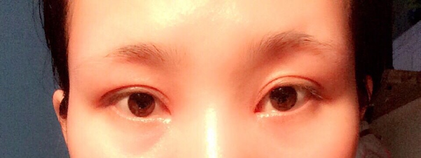 上睑松皮压至睫毛,有水肿,眼神呆板。反复修复过几次,仍未改变,反而愈宽、厚、重、形态更不好,皱襞瘢痕加宽,睑皮下纤维组织提取过多粘连过薄。