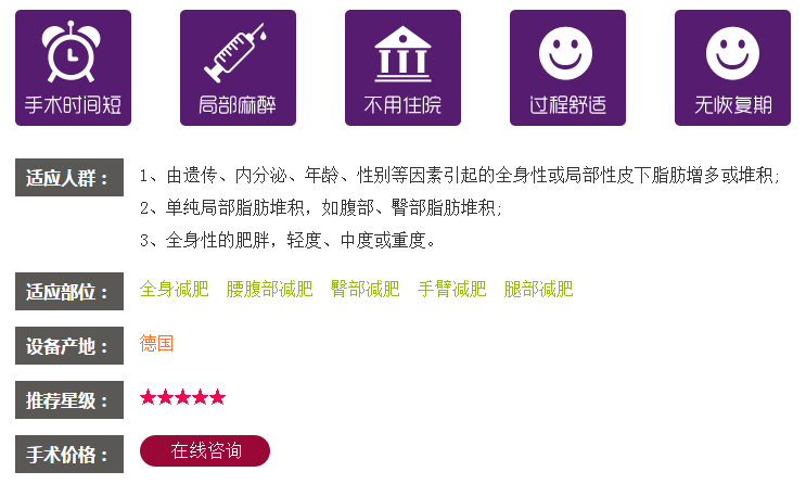 腹部定向吸脂:腹部肥胖容易诱发心脏病,高血压及糖尿病等。外观上,大腹便便影响形象。德国水雕360°吸脂术,还你平坦小腹。腹部脂肪层比其他部位要厚,北京京民的专家在手术时把皮下脂肪和全皮层脂肪一同吸出,较佳的术后果。