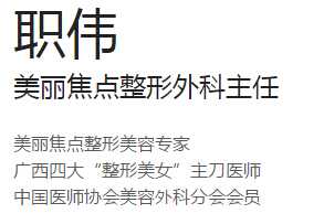 以上是关于对南宁美丽焦点职伟的一个简单介绍,被誉为广西四大“整形美女”主刀医师之一的职伟吸脂塑身到底好不好呢?由于篇幅的问题,小编可能不能继续很详细的为朋友们介绍,但是小编还是会建议患者们选择正规的医院,避免医疗纠纷,还存在有什么的问题的朋友可以点击在线咨询,24小时免费在线咨询哟!