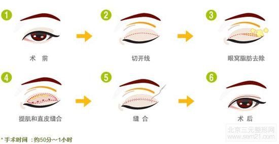 2、也适合于年龄较大,其上睑皮肤松弛和眶隔脂肪过多及对重睑手术果要求较高的单睑者。
