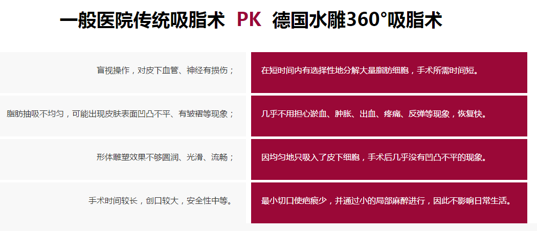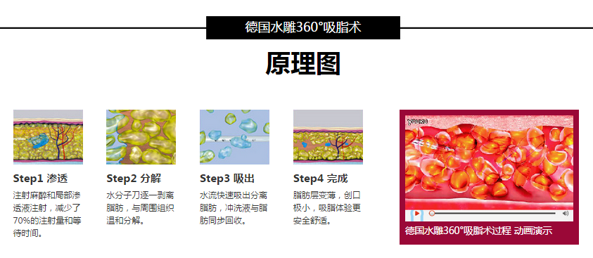北京京民引进国际较先进的德国水动力吸脂设备,其中水动力吸脂系统基于准确水动力原理的螺旋水刀,通过加压水流准确作用于目标组织,有选择性分离脂肪细胞,运用螺旋式水刀吸脂技术(WAL),不会对血管和神经造成损伤,具有治疗快速、果明X、风险大幅度降低等优势,并结合国际学术论坛上各位专家的经验分享,及我院临床上千例吸脂案例的经验总结,研发了一套适合亚洲人的专属塑形解决方案,从浅层到深层的逐层准确吸脂技术,适合各类吸脂人群,真正做到享受生活享"瘦"美 。