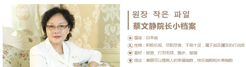 “作为一个女人,你可以拒绝整形,但无法拒绝美丽”这是蔡院长对女人整形的深刻理解。虽然她是一名医美专家,但她更是一个成熟而又魅力的职业女性,她懂得美丽对女人而言意味着什么。所以,在她从业三十年里,把求美者的需求当做自己至高使命,将医学、相学、美学结合,为顾客个性化设计,合理建议,用双手诠释东方之美,用果创造惊世之颜,因此被誉为“更懂女人心的医美专家”。