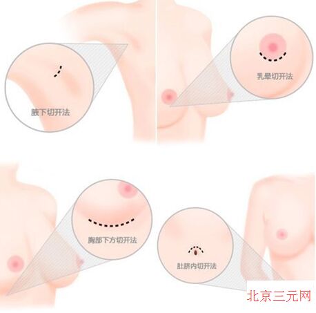 乳房下部切口:适用于伴有轻度乳房下垂的病例;切口设计在乳房下皱襞之下1~3CM,稍偏外侧;