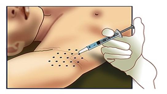 医生配置好药液后,在患者腋窝处标记出注射范围、注射点,然后按标记的注射点使用微针逐点注射BOTOX。注射BOTOX时一般不需要麻醉,如患者对疼痛敏感可进行局部麻醉。注射完毕后患者应轻轻压迫腋窝处10分钟左右,可以防止血肿的发生,一般注射BOTOX后3 天开始见。