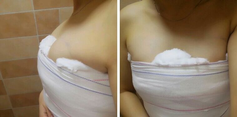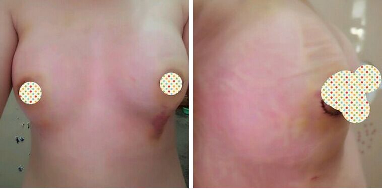手术第三天啦!还好做的乳晕切口没有像别人说的那么痛苦!今天拆开绷带换药赶紧拍了几张!右边乳房下面长了个小血包!刚刚问了医生,说是软组织拉伤以后伤到了毛细血管吃点药就没事了!一会买药吃去!明天继续多挂几天液体吧!