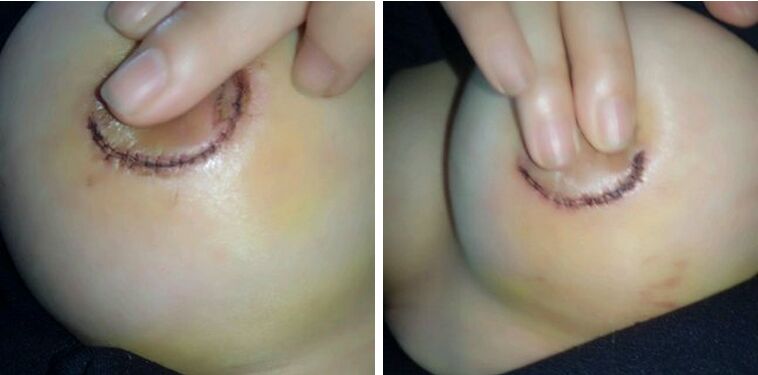 今天第8天去拆线了!伤口红红的看来要买点消炎药吃了!左边的胸明X比右边恢复的好啊!左边软些按上去也不怎么痛了!右边要硬点伤口还有一点没有长合!今天拆线的医生说本来那点没长好的要过两天才拆的!但是缝针是缝的一线连完的,一拆就会全部拆掉!希望没事吧!第三张是昨天还没拆线照的!去年买的游泳衣根本驾驭不了,现在可以了!哈哈!夏天可以嘚瑟嘚瑟了!!!