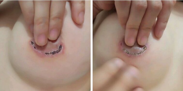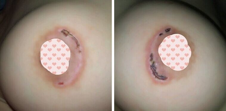 满足亲们的要求!都想看乳晕的疤!我自己感觉我选择乳晕切口真是选对了!做完就下床什么都可以自理,而且举手只有一点点疼,较重要的是周医生给我弄的切口真的好精致,缝针也缝的好仔细!心里特别感谢周医生,那天周医生给我手术我感觉冷周医生就把空调调到让我舒服,周医生自己弄的满头大汗的!谢谢周医生,您辛苦了!现在伤口恢复的很好!明天准备去拆线了,过两天开始擦疤克,应该疤痕能够很快不仔细看不出来的!