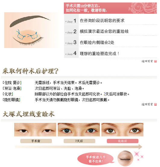 大塚式埋线重睑术没问题简单,完全不用手术刀。术中使用本院独创开发的重睑术专用H/I针和比头发还细的医疗专用线。只需在重睑线上的眼睑内侧缝合2处,既不必担心伤口也不必拆线。