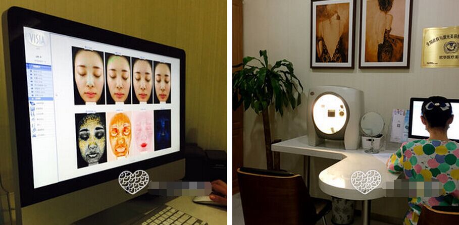 这个机器就是皮肤检测仪,可以测试皮肤深层和表层的问题,指数越高说明皮肤的情况越好,我的皱纹和紫外线色斑是较低的紫外线色斑指数竟然是3%吓死宝宝了,强烈推荐宝宝们给自己的皮肤做个检测吧!我平常确实懒得擦防晒,因为气垫BB里自带防晒指数为50,自以为防晒的很好结果根本没有卵用刘医生跟我讲必须要涂一层专门的防晒,而且室内都要30以上的~