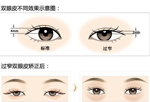 患者眼裂短,形成双眼皮宽,眼睛变圆;切口下缘眼轮切除不够双眼皮臃肿不自然;双眼皮外形与五官不协调。