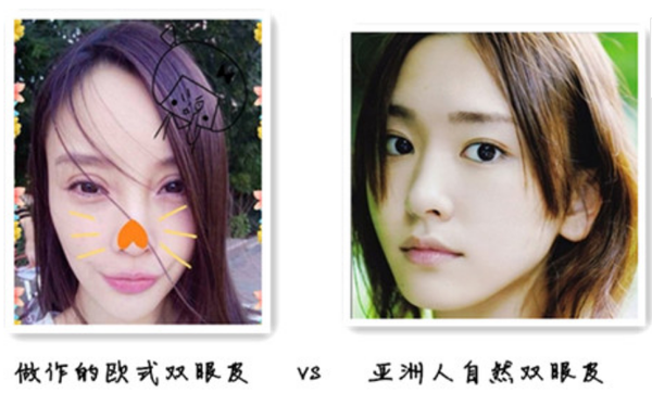 亚洲人一般没有西方人那样分明的轮廓,面部比较平的,没有突出的面部轮廓的人如果硬要追求像上面欧式双眼皮图片那样又宽又大的双眼皮的话,果可能会适得其反,会让人一看就觉得很生硬、不自然,甚至很凶的样子。
