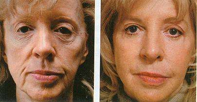 所示为面部重度萎缩皮肤松弛的情况,是一位 65 岁的美国女士,经过面部上提术、下眼睑上提术及颊部脂肪颗粒( 3 次)充填术后 4 个月的情况,看上去该女士年轻了近 20 岁。
