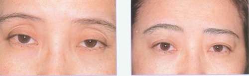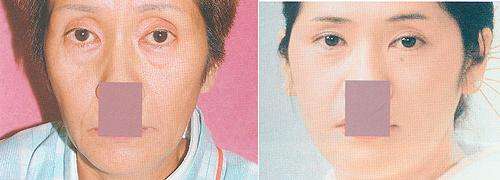 所示为上眼眶凹陷,这种情况是上眼睑内组织过度萎缩所造成的,使人显得衰老,用自体脂肪颗粒填充后,上眼睑组织显得丰满,改变了衰老的征象。
