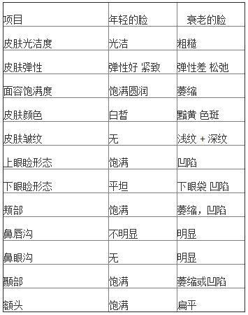我们先来看一张年轻的脸和一张衰老的脸究竟有什么的不同和特征,下面是一个比较图表: