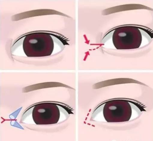 开眼角手术(一般都开内眼角)是在内眼角部位设计合适的切口,将内眼角多余的赘皮切除,缝合在如图虚线位置,将内眼角往鼻部迁移,使深藏的粉红色泪阜展现,从而拉长眼眶的范围。