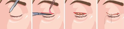 再回头穿出眼皮,打节后把线结埋入皮下,一般约要缝三针。