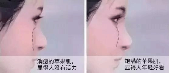 随着年龄的增加,肌肤的胶原蛋白和脂肪流失,脸颊开始下垂,原有的苹果肌也逐渐消失,泪沟法令纹等加深,容貌迅速显得老态。