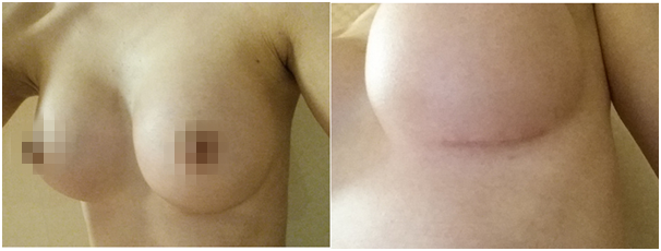之前手术前,查了很多资料,是打算去做水滴形腋下开口的,那样伤口在腋下皱纹的地方,就算有痕迹也看不太出来,唉,身体不争气,自身问题,腋下开不了,所以就开在胸下线,术后都不需要拆线哒~本来还担心伤口会较为明X的,但是一周过去后伤口就隐退了很多,意外的惊喜~