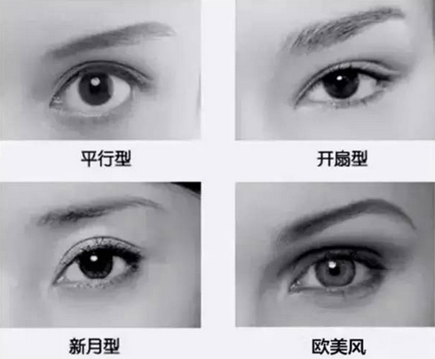 双眼皮的形状可以分为平行型、开扇型、新月形以及欧美型。现在欧美型确实特别流行,很多人都想做。欧洲人确实眶隔脂肪比较少,更重要的问题就是眉骨比较高,当眼睛陷进去之后,自然是一个很深邃的一个眼睛。