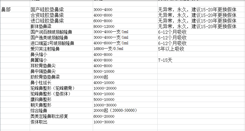 鼻部整形方式和材料价格表
