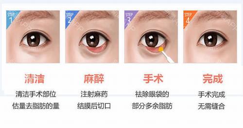 它是经下眼结膜囊内小切口,将眼部脂肪去除。因而皮肤表面无任何切口,深受青年患者欢迎,该方法主要适合于眶隔脂肪突出型,即由于眶隔膨出所致的典型眼袋,无下眼睑皮肤松弛与皮肤皱褶者。