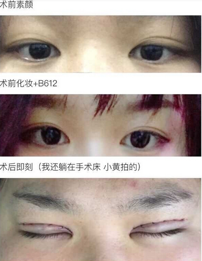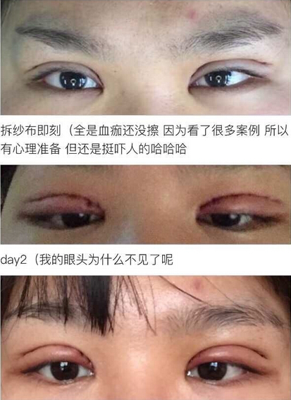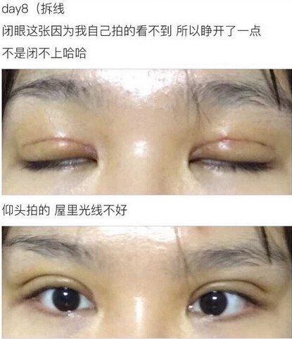 然后出了手术室像个瞎子(一定要你百分百信任的人陪你奥),门口小卖部有卖冰袋,20—个可真贵,敷一下不出血就滚回宾馆了,然后我只买到俩冰袋敷完没了就昏天暗地的睡,因为麻药过了很痛,第二天揭开纱布(因为之前看了很多案例有心理准备哈哈哈),丑到绝望,用医院开的眼药水拿棉签擦擦然后,然后,我就带上墨镜回北京了,在家呆了八天我就去拆线了,在这说一下(我去八大处国贸分院不给拆,又去了三里屯善方医院,倒是给拆,快一千,拉倒吧,较后在朝阳医院(三里屯那边),挂号42,拆线加药费不到100(医生说不是她缝的只能给我拆她肉眼看到的),给我吓得不行,后来问小黄说拆不干净没关系,自己会长出来的,到家一看真没拆干净,右眼头有一点点没关系了,我也不在意
