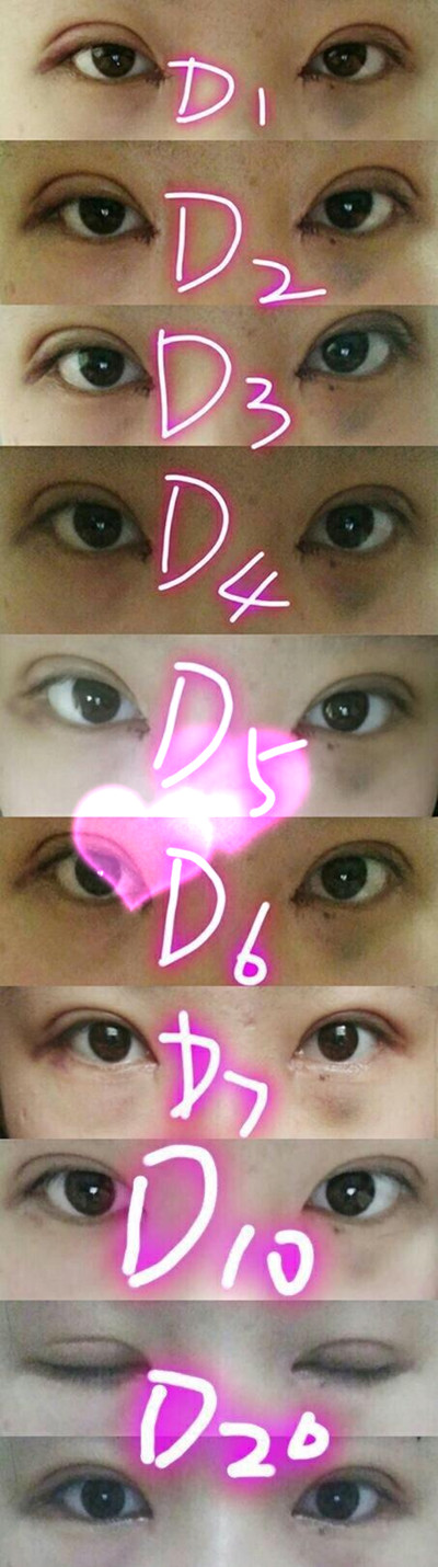 含心得分享,自己要保持好的心态,之前右眼下有淤青一直不消心里很着急,拆线的医生哥哥说勤做热敷,较近也消得差不多了,在朋友圈发过照片同学朋友很多说看着别扭啊吧啦吧啦的,但是家里人和我十多年的闺蜜都说很好看,只有真正了解你的人才会知道你到底适不适合,所以我选择忽略那些声音,等完全消肿了一定惊艳你们,真的很谨慎案例什么的大概看了两年,每天都会刷案例反馈,蟹蟹各位小仙女儿,心动不如行动啊^