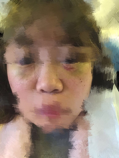 图一动手术之前,图二刚动完手术肿得像猪,图三一周像僵尸...淤青,血丝。图四两周时太阳下还有黄色淤青。全部恢复医生说2-3月