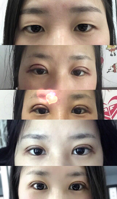 手术一个小时四十分钟,打麻药疼,设计的时候刘医生说我这只能幵窄一点的,我问他那会不会内双,他说内双总比假宽好,我觉得也是这个道理,反正我也不追求大外双,只要眼皮抬上去,睫毛露出来就很满意啦!