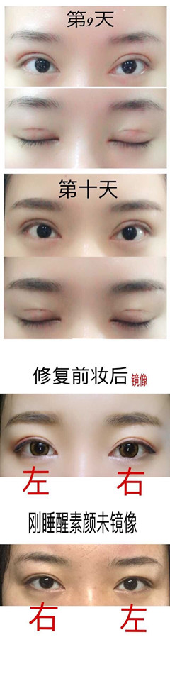 现在第十天,右眼眼头比较宽不知道是手术的原因还是肿胀的原因,其实挺怕后面会一直这样的,有和我一样的吗?还有就是眼头的睫毛依旧翘不起来哈哈哈哈哈哈哈我要放弃了不知道为啥但是相比上次真心希望不要再压睫毛了不过右眼的眼头让我不得不担忧会压睫毛。但总体比上次满意,我爸爸也说比上次好。