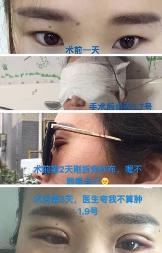 开始回家了,天啊到家就上火,没提前买冰块, 怎么冷敷啊,那个急的呀,一个小时后吧,冰敷的也不好,家里冰箱又坏了,卖冰牛奶,买冰块,第二天也没敷了,啊, 总结一句话全切双眼皮手术过程中至少我觉得是跟女人坐月子一样一样,提前感受女人坐月子, 那个挣扎呀,马上都抑郁症了,天天青菜,好吧第五天换清汤排骨了,喔,感受太多,到此为止,终于告别内双了,送给爱美的妹子, 要做就抓紧, 较好冷天做,术前了解的越多越紧张,还有就是谁他妈再说全切双眼皮是很小的手术我就跟谁急,太紧张太挣扎,为了美也是豁出去了