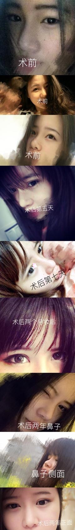 前三张照片是术前的,后面是术后第五天,术后第七天,术后两个月妆后,术后两年的鼻子,鼻子侧面,术后两年正面