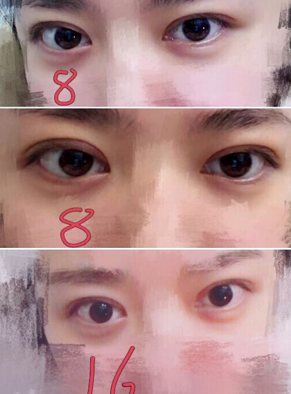 2017.1.22上海九院周一雄医生全切双眼皮手术,没有开眼角,价格4100+,本人眼睛轻微肿泡眼,而且还有大小眼,叫熊大给我调一下但是他说宽度形状都不是我能选择的替所以做完还是大小眼,不过生活中也没人注意到也就无所谓了。宽度一只眼睛7mm,一只眼睛7.5mm(我一直没想通为什么小的那只眼睛做的7!)