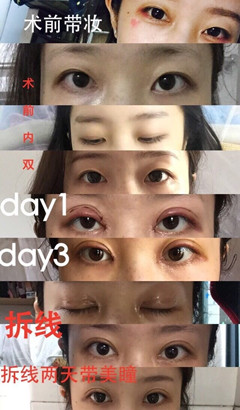 术前我是内双的眼睛,带妆拍了照片,发给大家看看,下面依次有术前的,术后第一天,术后第三天,拆线睁眼闭眼和拆线两天后带美瞳拍的