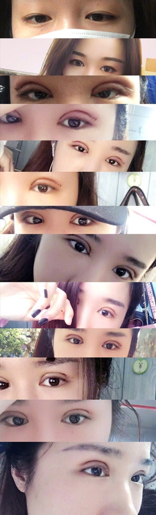 我做完手术也来分享经验来啦,照片上第一张是没做前素颜的,第二张是没做前化妆贴了双眼皮贴拍的,第三张是做了手术的第一天,倒数第三张是拆线后过了十天了,感觉自己恢复挺快,所以来分享啦,我是在上海做的,医院是上海九院整形中心,给我做手术的是陈付国医生,我做的是全切双眼皮手术,价格一共花费了七千多元钱,但是没有开眼角。