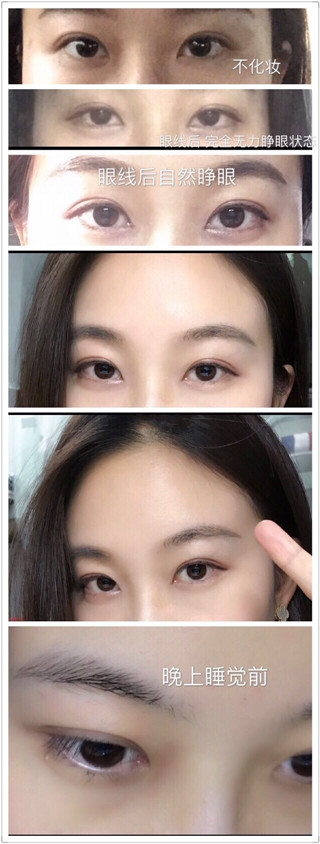 照片可能不太显,现实中一个月应该有很大肿胀的。包括我现在也是有的,自然睁开已经自然了,但是向下微看,阳光下还是会发现有些肿的3不是说一年之内不谈肉条吗。图一:对比图图二差不多60天左右图三平常拍照(里面第一张是一个月,其余50天+〜60天+日期按顺序)第三张都是较近拍的早上起来还是会肿的然后我本来的不连眼头的扇形好像被我内眦赘皮牵住了