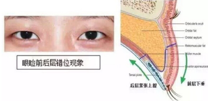 第二个常见陷阱是上睑前后层错位现象。前后层分离错位现象在国人中很常见(如图)。较典型的临床判断就是患者上睑缘的睫毛退缩,藏到上睑下方的皮肤缘后,上睑睫毛被压向眼球角膜。前后层分离错位主要原因在于下垂眶隔筋膜的分隔作用,轮匝肌与睑板提上睑肌腱膜间的粘连受阻,紧张上提的睑板提上睑肌腱膜与相对松弛下垂的上睑皮肤发生错位,导致皮肤缘在睑缘下方。在三点式重睑成形中,这种分离错位现象将对重睑造成两方面重要影响。一是由于小切口的限制,下垂的眶隔筋膜无法分离切除,同时妨碍了睑板上缘的识别和固定,导致重睑弧度的不可控性。二是同样由于切口的限制,无法做轮匝肌提上睑肌腱膜粘连,无法形成重睑下唇皮肤的提拉,无法翻转出后压的睫毛。术后重睑下唇必然浅浮、臃肿,远期甚至消失。这种错位下若仍依从病人强行行三点法重睑术,势必被坑埋。
